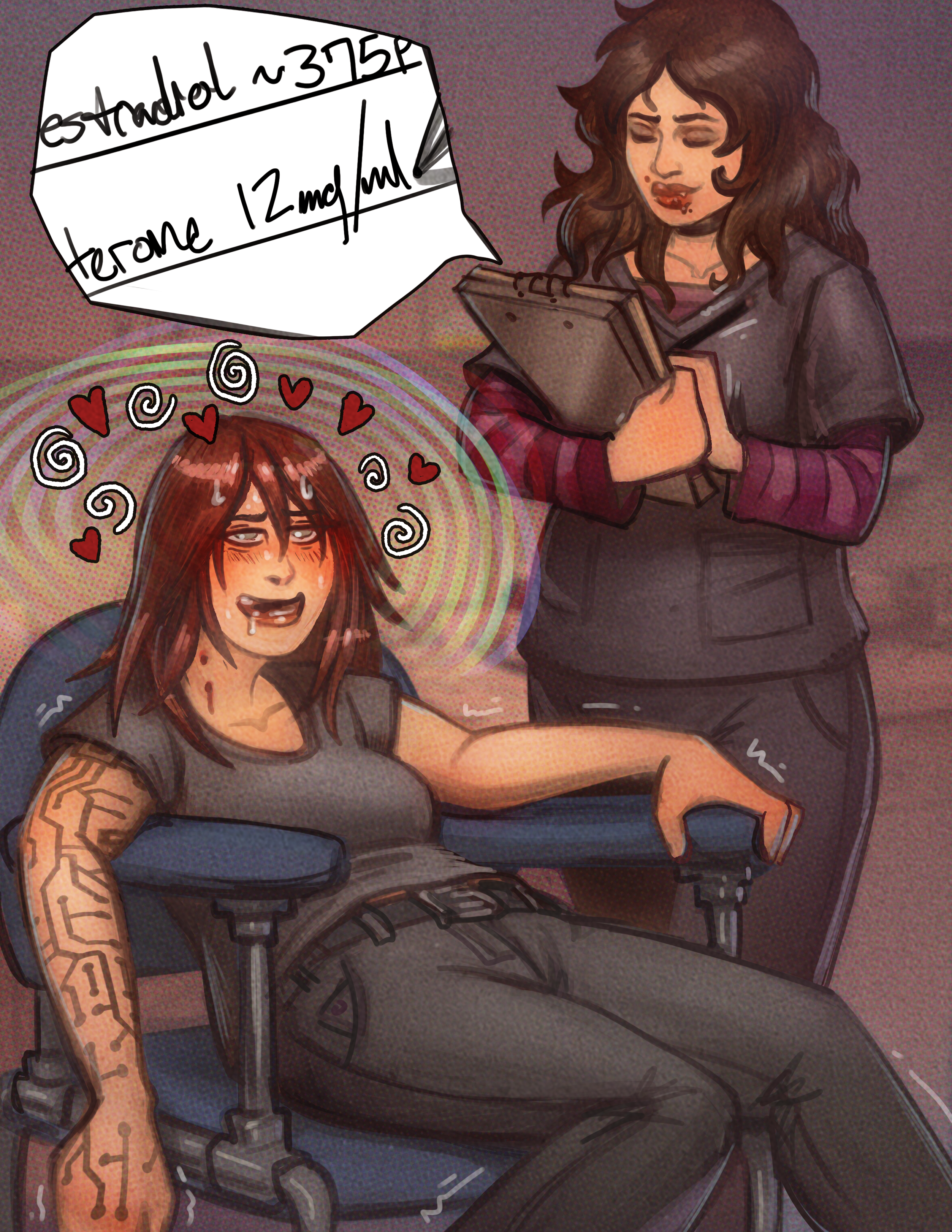 Phlebcorp2024/03/02Art by Gwah Inspired by a recent trip to have bloodwork done Thanks to Princess Grace for reviewing and proofreading "Discover your hormonal health with precision with the PhlebCorp comprehensive estradiol test, which provides valuable insights into the health of your endocrine system," it says on the purple and white brochure that you're idly flipping through in the waiting room. It's just after 9:30am, and you're sitting in a rather uncomfortable chair in an alcove in the back of the local HealthLine drugstore. Outside of the alcove there's a sign hanging that says "PhlebCorp: We Never Miss A Vein" On the wall behind you, a few feet to your left, there's a door with a smoked window where, presumably, PhlebCorp does their patient services. PhlebCorp is a new medical diagnostics company that recently expanded into your market to try to compete with West Diagnostics. They're not covered by your health insurance yet, but from what your other trans friends have said, they're better than West Diagnostics by a long shot and well worth the out-of-pocket costs. You think back to the last time you were at West for your labs over a year and a half ago, something you'd been putting off doing for over a year after what happened last time. You were there for over an hour and a half, being slowly made a pin cushion of while three different nurses sloppily tried seven times to try to get a successful draw. Really, it'd been longer than that; they never did end up getting a successful draw last time at West. Your doctor has been bringing it up in semiannual appointments, messages in their online patient portal, even threatening to discontinue your prescription if you didn't get your labs done. With that, she kind of forced the issue. You've had to endure through periods of a couple weeks without hormones in the past due to pharmacy stocking issues. Those brief periods without hormones had been your closest to rock bottom in years. "Miss Hopper?" A woman with a rough and untrained voice calls. "Is there a Miss Hopper here?" You snap back to reality, having been adrift in your thoughts for almost 15 minutes. You glance down at your aging digital watch, with its enormous black bezel and unsightly 90s rectangular body. It's 9:43, just ahead of schedule for your 9:45 appointment. "Sorry, yes, that's me," you say as you turn to your left. There's a woman standing in the doorway calling you to the back room. She's tall, at least a good 3 inches taller than your modest 5'9", and has the palest skin you've ever seen. Nearly as white as a sheet of plain paper. She's wearing greyish-blue scrubs, with a striped purple long-sleeve shirt poking out around the collar. She has wavy, shoulder-lenghth dark brown hair. She's wearing a wide red lanyard, midway down the length there's a she/her pronoun pin, and a progress pride flag pin. Her ID badge hangs from the lanyard, identifying her as "Marilyn Acula, NP". You stand up, following her into the back room. The patient service room is nothing special. There's a number of nondescript cabinets along the walls above and below the counters that line most of the walls of the room. There's a pair of sturdy chairs, where they could probably take a second patient if there was another lab technician working. She points you to the nearest chair, which is pulled out about three feet from the wall. That's weird, usually it's up against the wall. You sit down as she pulls up your patient records on a small computer across from the patient seating. You can't see what it says, from your position it's just a black glossy square because of the privacy screen they installed to help comply wth patient privacy laws. After a few seconds, she asks "name and date of birth?" "Alice Hopper, June 19th 1995", you reply "Perfect, let's get started." she says. She starts rummaging through the drawers for the supplies she needs. Instinctively, you stick your right arm out on the armrest with your elbow facing upwards. You've done this before many times, you know the drill. You might as well make this easy for the both of you, you think. You start pumping your fist, supposedly it helps make the vein on the inside of your elbow really pop so the phlebotomist can find it. You watch her as she gets ready, continuing to pump your fist. She ties her hair back; with hair that wavy, it must be a hell of a time trying to keep it under control otherwise. In a rather unexpected move, she puts on a cloth bib, the kind you'd typically wear at the dentist to catch drool. She turns back to you, looking down at your arm as you try to get ahead of the instructions you're anticipating from all of your past visits to have lab work. Giggling, she says "You can put your arm down, dear. We won't be needing it for your lab work today." She continues, "Since we're just doing a basic metabolic panel, estradiol, and testosterone, I can have those results for you before you leave here today." She pulls up the other chair from your left, and sits down across from you. "Alice, that is your preferred name, correct? May I call you that?" she asks. "Yes, Alice is perfect," you reply "So, Alice, here's the deal: For routine bloodwork, we operate a lot differently from any of the other medical diagnostic labs out there. See—" She pauses, opening her mouth and pulling up the edge of her lip to show off her sharp, almost unbelievable fangs. She continues, "A lot of the phlebotomists here, myself included, are vampires. Not quite like we're depicted in media, we're not evil beasts out to kill. We drink blood, sure, but we're otherwise pretty much normal people. We can also transform into bats, which is pretty cool, I suppose. About 15 years ago, PhlebCorp was founded by a breakaway group of trans vampires trying to escape the ways of old and fit into human society. Really, for us, it's mutually beneficial. We've trained to be able to quite accurately detect hormone levels, blood sugar levels, and a variety of other